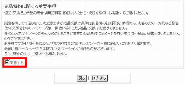 またご購入カートのSTEP4ご購入内容最終確認でも下記の様な画面で返品特約への同意画面とチェックボックスを設定いたしました。