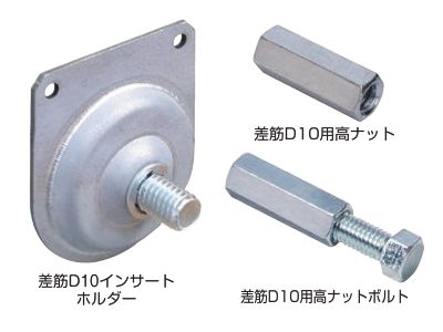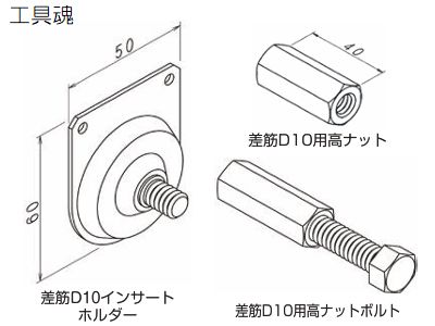| 品番 | 品名 | 入数 | 8206242 | 差筋D10インサートホルダー | 10 | 8206243 | 差筋D10用高ナットボルトセット | 30 | 8214362 | 差筋D10用高ナット3/8x40 | 100 |