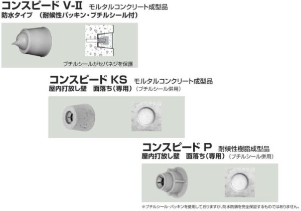 下記のバリエーションがございます。カートで選択ください(ご提供価格がご確認いただけます)| 品番 | 適合セパレーター | 入り数 | 付属品 | 用途 | KS-25 | W5/16 | 800 | 無し(ブチルシール別売) | 内部 面落ち | P-25 | W5/16 | 1000 | 無し(ブチルシール別売) | 内部 面落ち | V-II25 | W5/16 | 600 | ブチルシール6本付き | 内部 面落ち | V-II30 | W3/8 | 600 | ブチルシール6本付き | 土木・内・外部 面落ち | V-II40 | W1/2 | 250 | ブチルシール5本付き | 土木・内・外部 面合せ | V-II50 | W5/8 | 150 | ブチルシール5本付き | 土木・内・外部 面合せ |