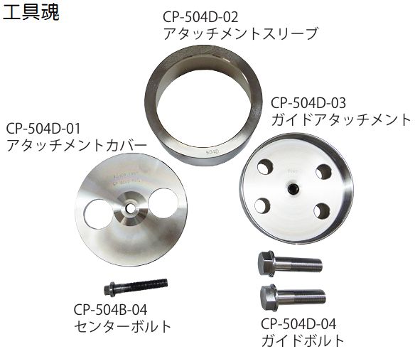 | 補修部品型式 | 品名 | 必要数 | CP-504D-01 | アタッチメントカバー | 1 | CP-504D-02 | アタッチメントスリーブ | 1 | CP-504D-03 | ガイドアタッチメント | 1 | CP-504B-04 | センターボルト | 1 | CP-504D-04 | ガイドボルト | 2 |