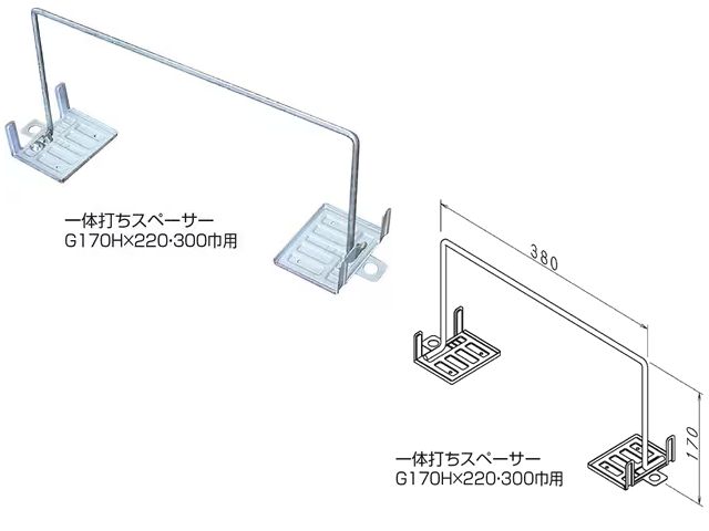下記のバリエーションがございます。カートで選択下さい。(ご提供価格が確認いただけます)| 品番 | 品名 | 入数 | 8205731 | 一体打ちスペーサーG 170HX380W | 50(TY) | 8208825 | 一体打ちスペーサーG 170HX320W鋼管杭用 | 50(TY) | ※8205748 | 一体打ちスペーサーG 170HX600巾用 | 30(TY) |
