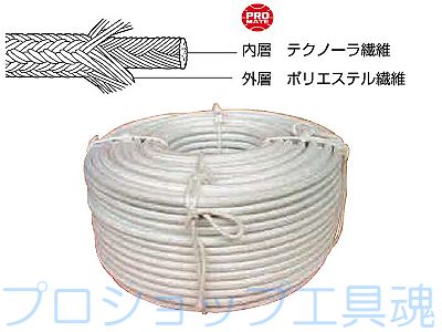 | 品番 | 径(mm)×長さ(m) | 質量(Kg) | 破断荷重 | R-0810A | φ8x100m | 約5.3 | 32.5kN | R-0820A | φ8x200m | 約10.6 | 32.5kN | R-1010A | φ10x100m | 約8.3 | 49.4kN | R-1020A | φ10x200m | 約16.6 | 49.4kN | R-1210A | φ12x100m | 約11.2 | 69.5kN | R-1220A | φ12x200m | 約22.4 | 69.5kN |