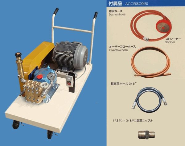 ●付属品:吸水ホース、ストレーナー、オーバーフローホース、超高圧ホース3/8"、1/2(R)×3/8(G)超高ニップル