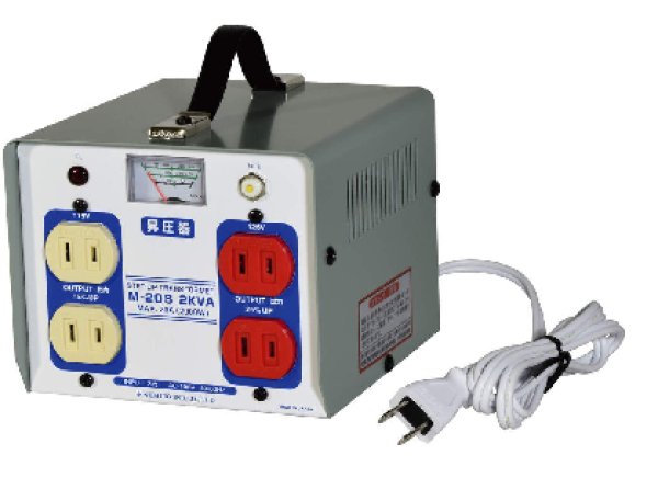 | 電線長(m) | 1.3m | 電線種 | VFF 1.25mm²✕2心 | 入力プラグ | 2Pプラグ | 入力 | 100V | 出力 | 115V、125V | 容量 | 2KVA | 出力コンセント | 115V(15%)×2、125V(25%)×2 | サイズ | W145✕D160✕H160mm | 質量 | 5.4kg |