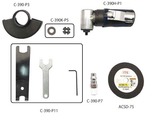 | 製品型式 | 品名 | 要数/備考 | C-390K-P5 | ディスクナット&カラーセット | 1個/ C-390H、K共用 | C-390-P3 | ディスクカバー | 1個 | C-390-P11 | スパナセット | 1個/ C-390、H共通 | C-390-P7 | カプラー20PM | 1個 | ACSD-75 | カッティングディスク(20枚入り ) | 1個 |