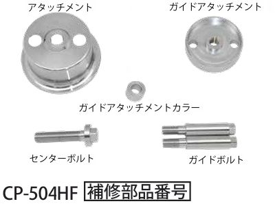 下記のバリエーションがございます。カートに無い型式はお問い合せ下さい。| 製品型式 | 品名 | 要数 | 備考 | CP-504HF-01 | ガイドアタッチメント | 1 | CP-504HF-02 | カラー | 1 | CP-504J-01 | アタッチメント | 1 | CP-504J-03 | ガイドボルト | 2 | CP-504E-04 | センターボルト | 1 | M14XP1.5-107.5L-17h |