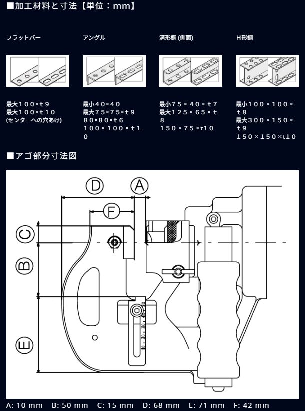 | モーター | 1050W、50/60Hz二重絶縁 | モーター電圧(V | )単相100 | 外形寸法(長さL×幅W×高さH)(mm) | 524×129×325 | 最大奥行(mm) | 50 | 最大穴あけ能力 | (ステンレス鋼材SUS304)Φ20/t6、(一般鋼材SS400相当品)Φ20/t9 | 質量(kg) | 11.4 | 付属品 | ポンチΦ14mm(本体にセット)、ダイスSB14(本体にセット)、グリップ、ナット締付棒、六角棒レンチ(3・4・5)、スパナ(8×10)、商品ケース、ワークスタンド |