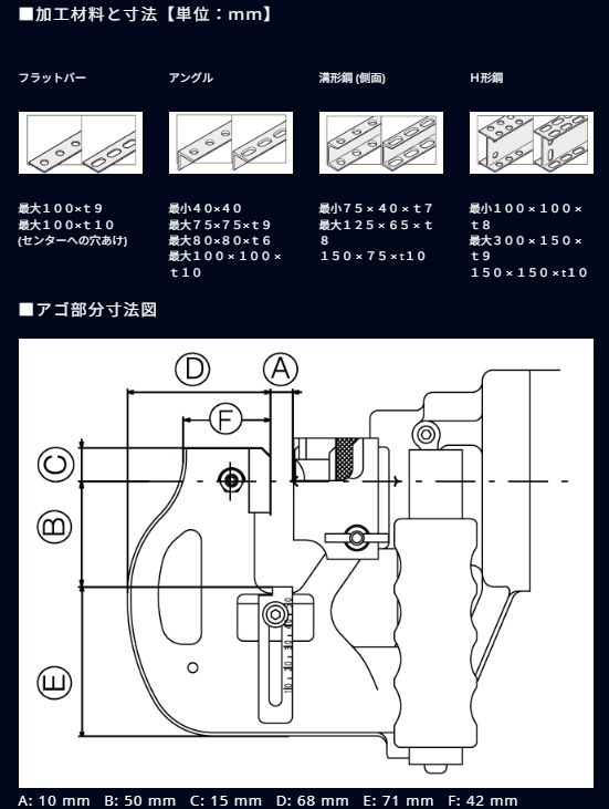 | 丸穴ポンチ | 丸穴ダイス | 一般鋼材 (SS400) | 溝形鋼 (傾斜面) | ステンレス (SUS304) |