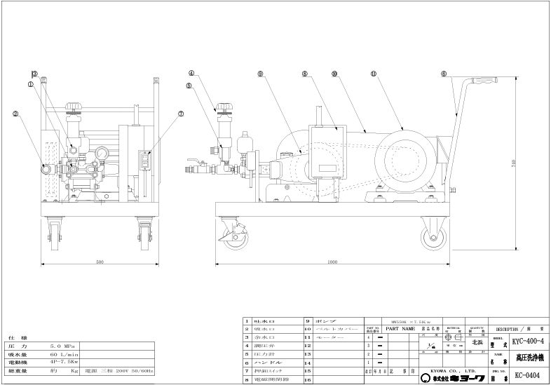 | 最高圧力Mpa | 吸水量l/min | 定格 | 出力KW | 起動方式 | 質量(kg) | 寸法(長さL×幅W×高さH)(mm) | 5.0 | 60 | 三相 200V | 3.7 | 直入れ | 150 | 1000×500×780 |