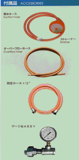 ●付属品:吸水ホース(ストレーナー付き)、オーバーフローホース、耐圧ホース、ゲージ台ASSY 各1