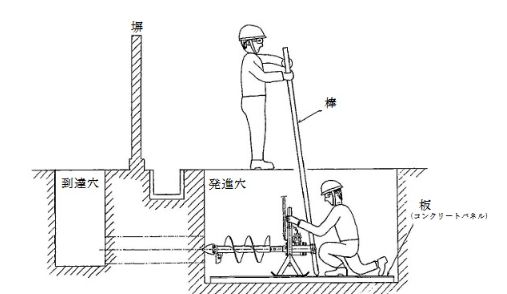 硬い土質の場所では、反力を受ける棒を「てこ」として使い、横掘ハンドオーガーを前進させる