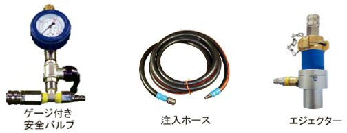 ●付属品(ゲージ付き安全バルブ、10m注入ホース1/2”、エジェクター(エア抜き器具))