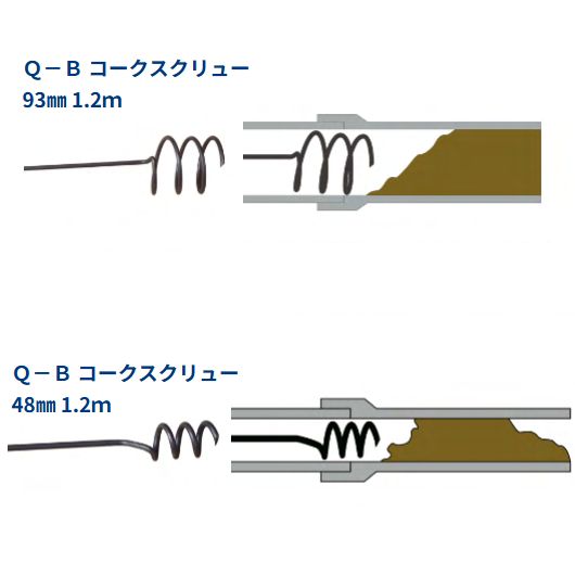 下記のバリエーションがございます。カートでCAT No.選択下さい。| 品名 | 商品コード | CAT No. | 長さ | 外径 | 適応管径 | Q-B コークスクリュー 93mm 1.2m | 303001100010 | PB-3-3R | 1.2m | 約φ93mm | 100A〜150A | Q-B コークスクリュー 48mm 1.2m | 303001100015 | PB-4-3R | 1.2m | 約φ48mm | 50A〜75A |